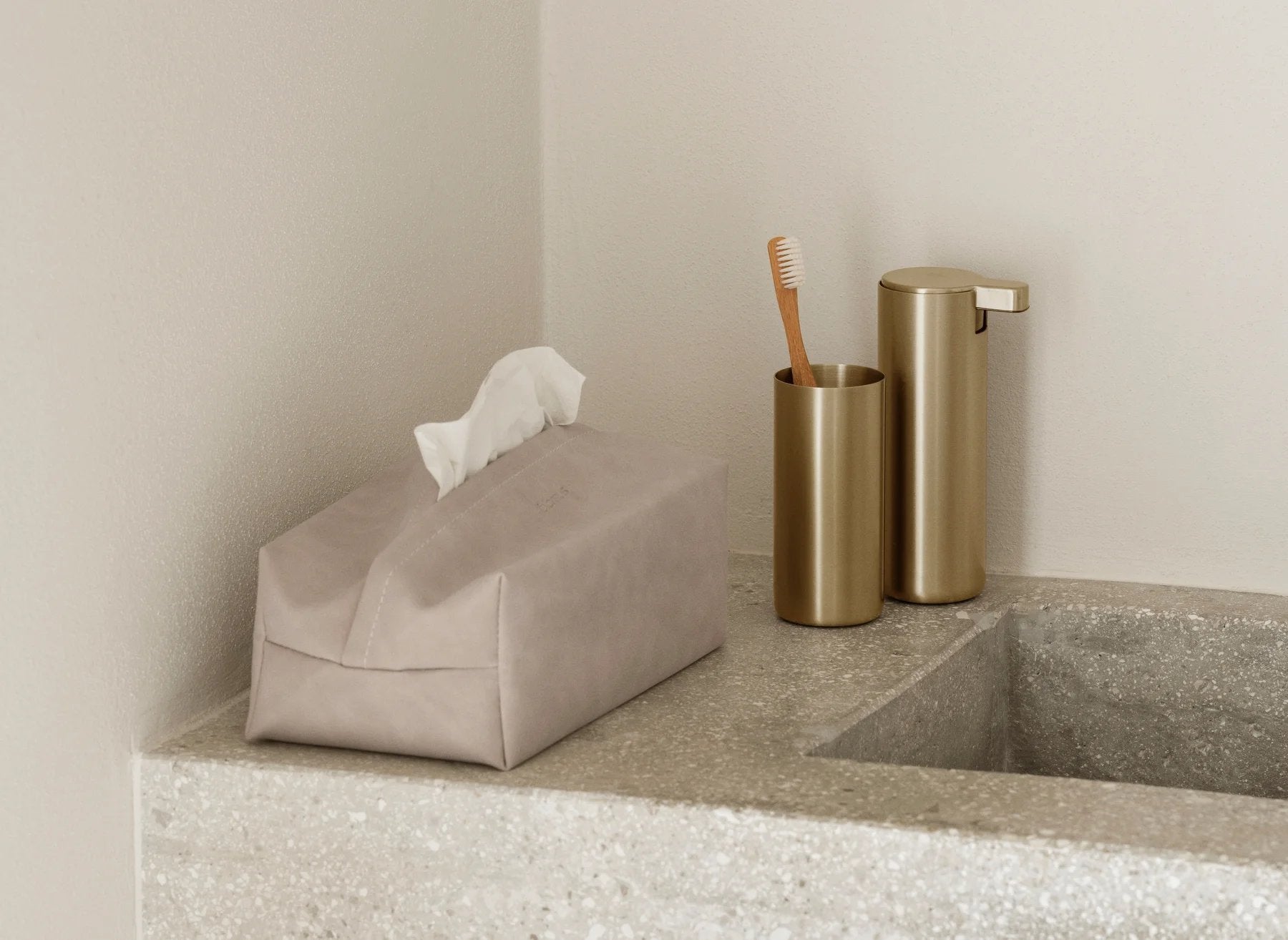 Der Modo-Becher aus Stahl in der Farbe Messing hat eine schlanke Form mit einem Durchmesser von 5,5 cm. Dieser 12 cm hohe Zahnbürstenhalter hat ein schlichtes Aussehen und die Unterseite ist mit Silikon versehen. So verhindern Sie Schäden an Ihrer Spüle oder Arbeitsplatte. Auch für Make-up-Pinsel verwendbar!
