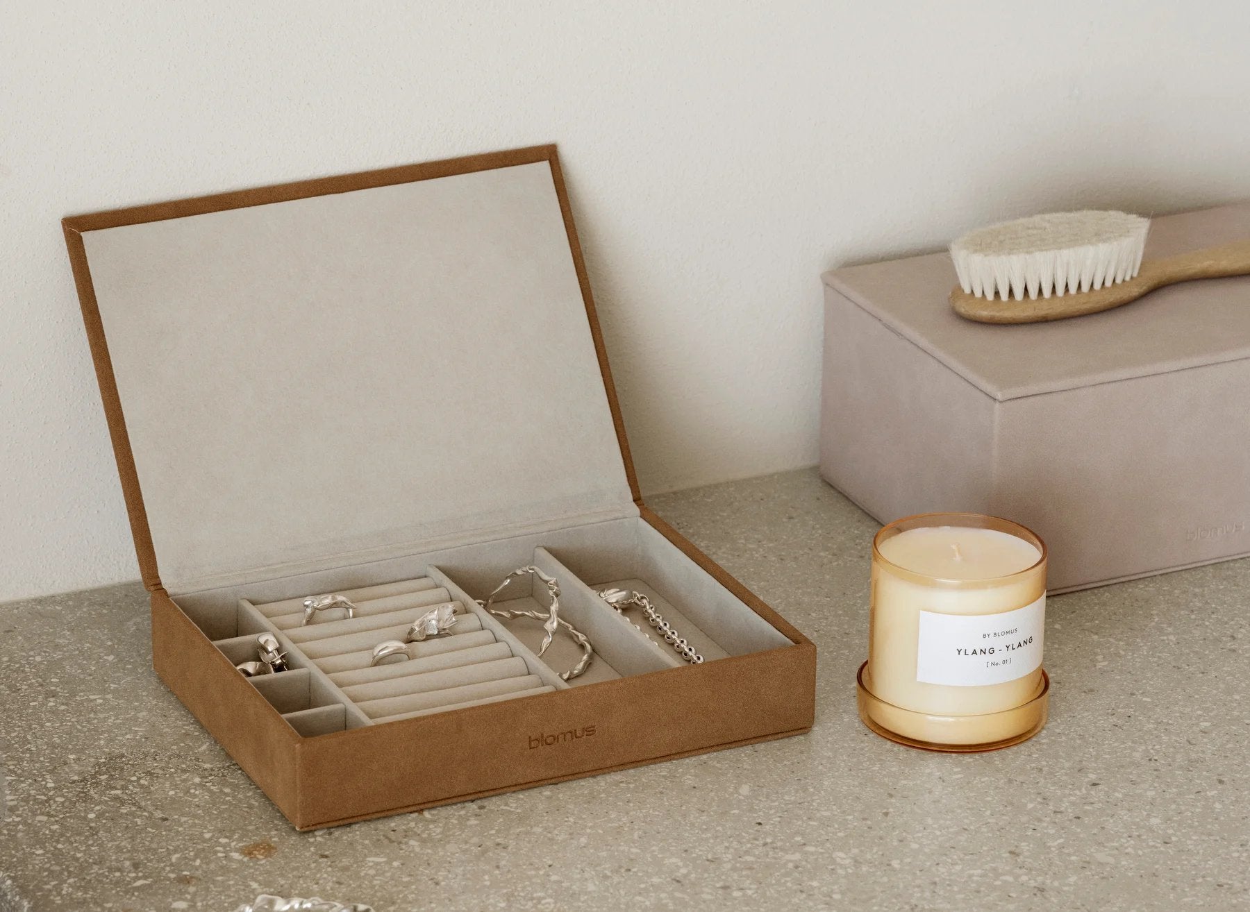 Bruine sieradendoos van faux suede, gemaakt van zeer stevig karton dat voorzien is van een laag PU leer (vegan). Deze Blomus sieradendoos heeft een afmeting van 15,5x22 cm en is 4 cm hoog. De sieradenbox is voorzien van een deksel en aan de binnenzijde zitten een aantal vakken waarin je je kettingen, armbanden en ringen netjes kunt organiseren. Sahla betekent 'simpel en discreet' in Samoaans, wat de uitstraling van deze sieradendoos in jouw badkamer of slaapkamer goed omschrijft.