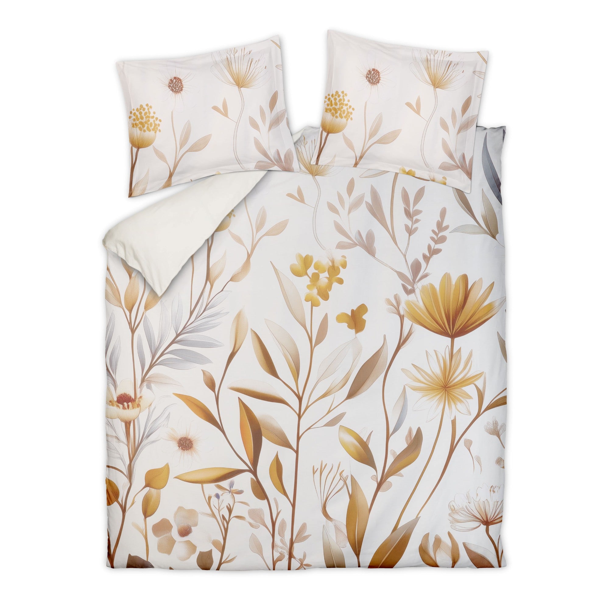 Gebroken wit eenpersoons dekbedovertrek uit de Satin Printed collectie, gemaakt van soepele satijn katoen. Op de bovenzijde van het Daydream dekbedovertrek zie je een dessin van takken, bladeren en bloemen in beige, bruine en goudgele tinten met ook een beetje grijs. De achterzijde is effen offwhite gekleurd.