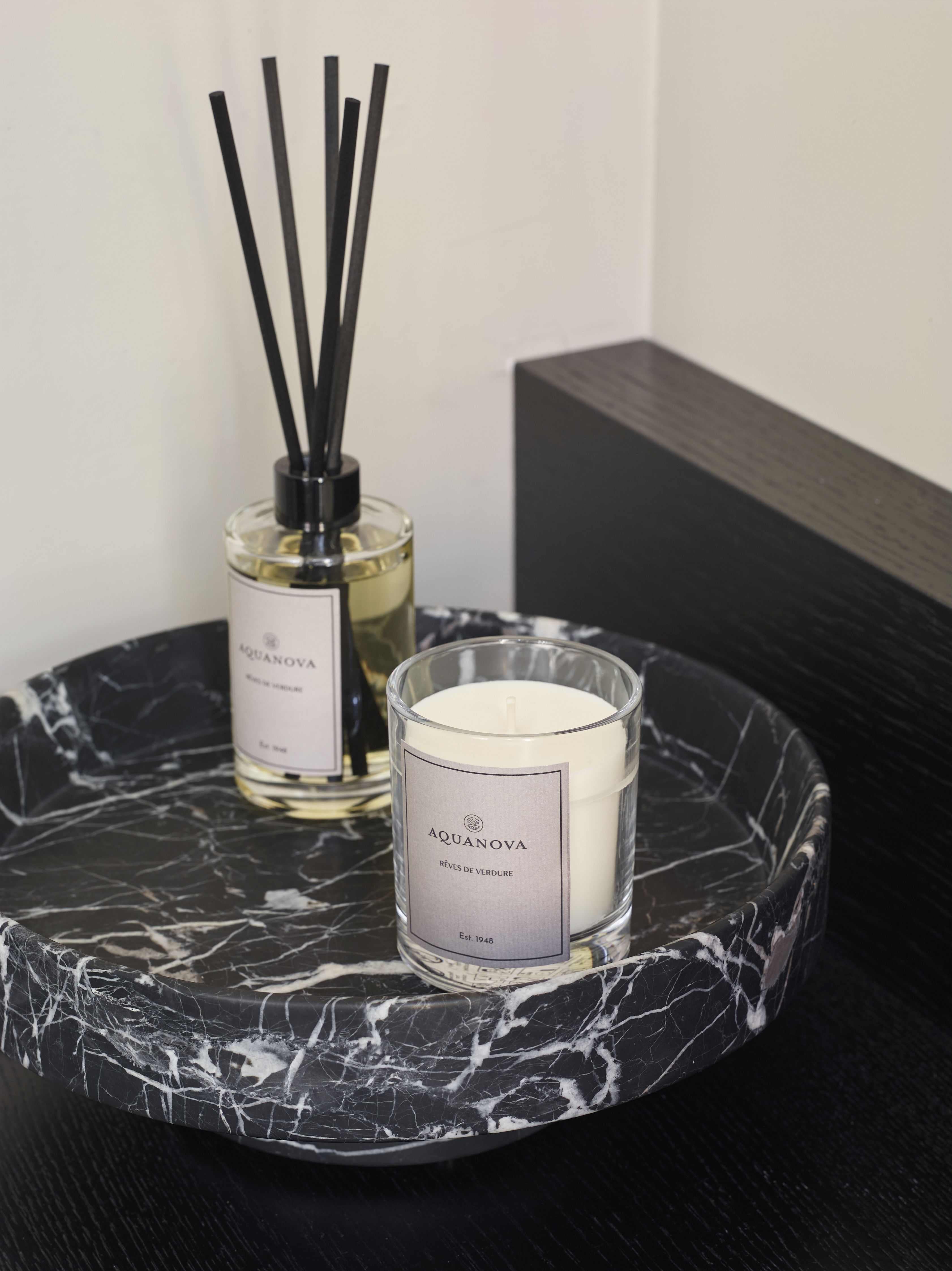 The round plateau from the Nero series by Aquanova is handmade and has a luxurious look. This is due to the natural stone with chic marbling.