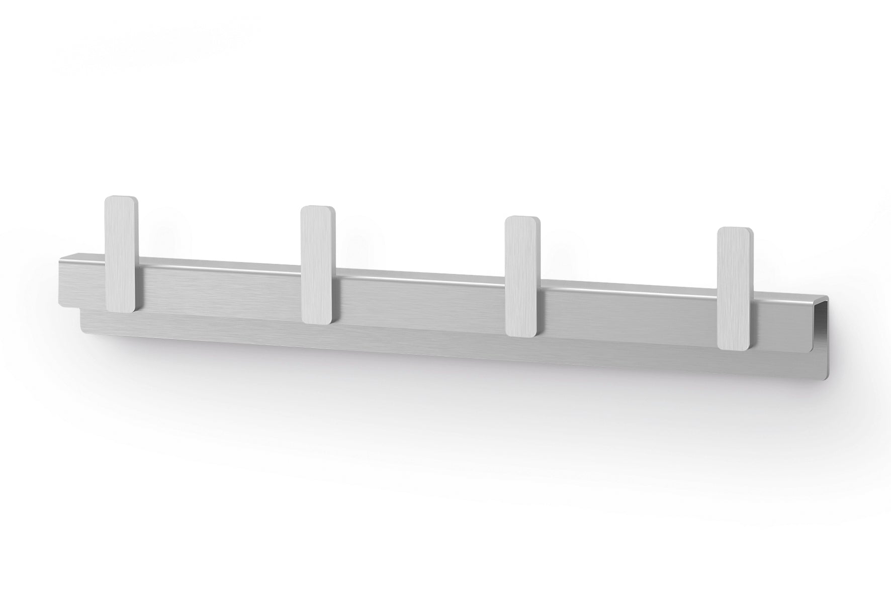 Deze mat rvs, zelfklevende kapstok uit de Potes serie heeft 4 haken en is 24 cm breed. De kapstok is geschikt voor alle gladde oppervlakken, inclusief zijwanden van keukeneilanden en ander meubilair. De afstand tussen de haakjes is 6,5 cm, de kapstok is 4,5 cm hoog en heeft een diepte van 1,9 cm.