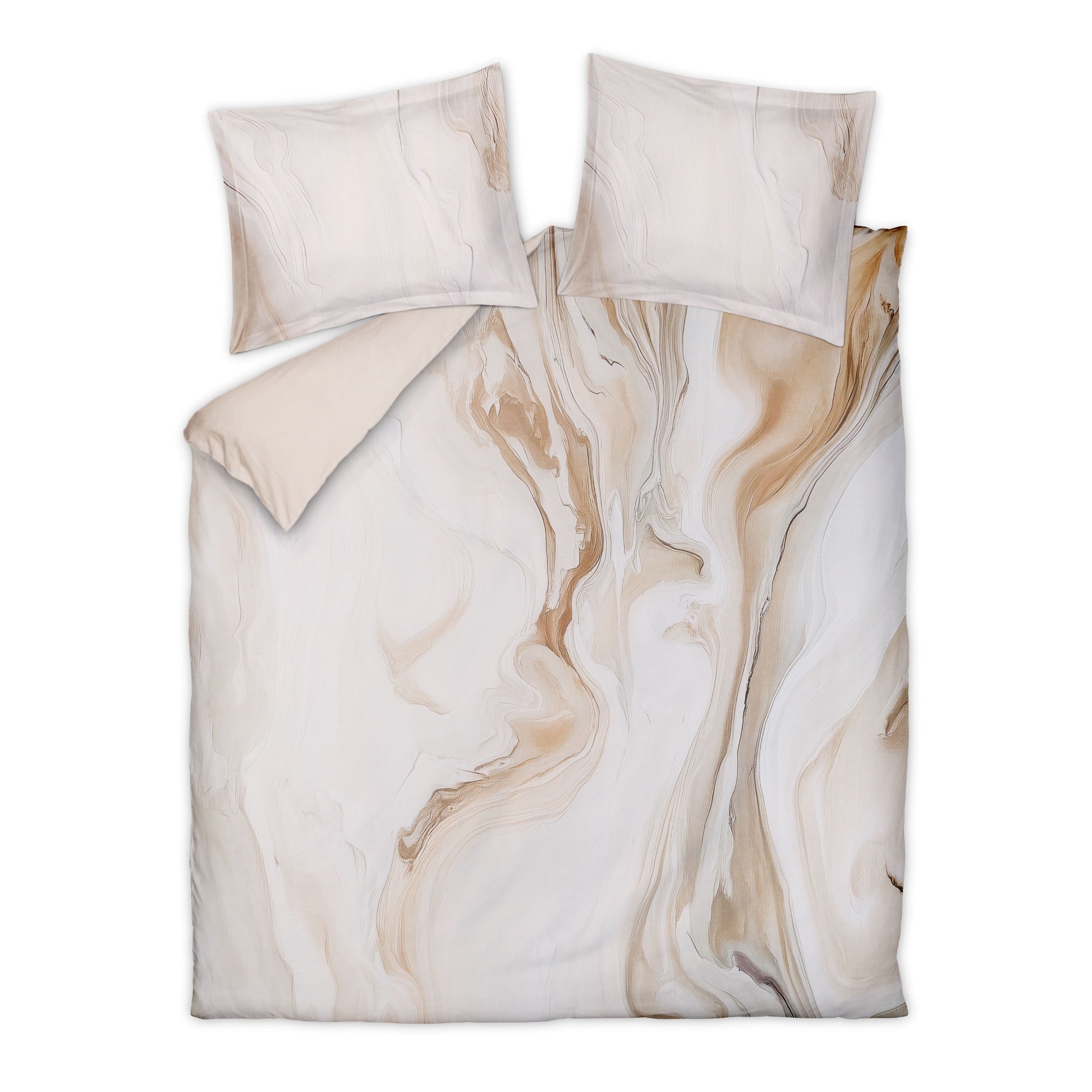 Licht beige lits jumeaux dekbedovertrek Sandstone uit de Satin Printed collectie met dessin dat doet denken aan gemarmerd natuursteen en heeft mooie zandkleuren. Het dekbedovertrek is gemaakt van soepele satijn katoen met de print aan de bovenzijde en een effen onderzijde in crème kleur.