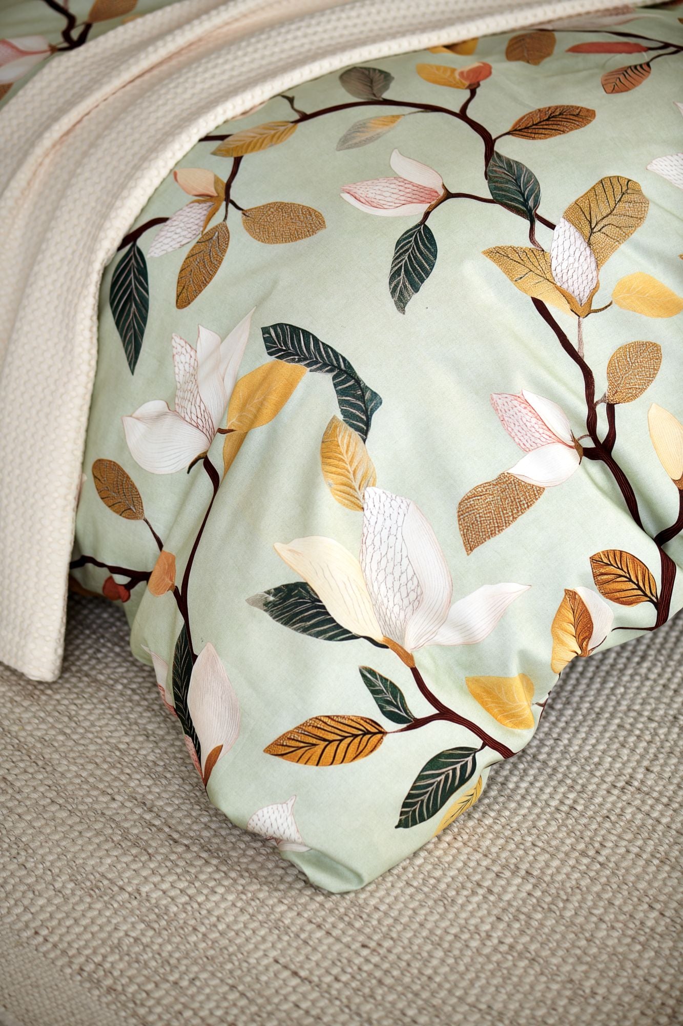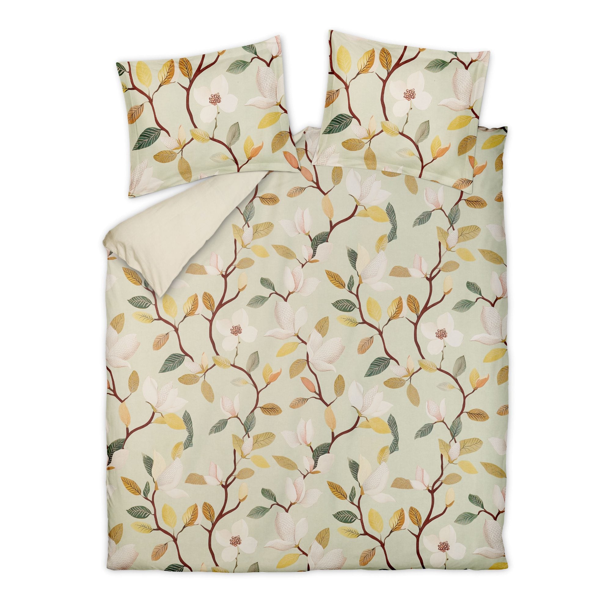 Lichtgroen lits jumeaux dekbedovertrek Twiggy uit de Satin Printed collectie met aan de voorzijde een all over dessin van kronkelige bruine takken met bladeren in diverse tinten groen, geel, oranje en wit. Het dekbedovertrek is gemaakt van soepele satijn katoen en de onderzijde is effen lichtgroen.