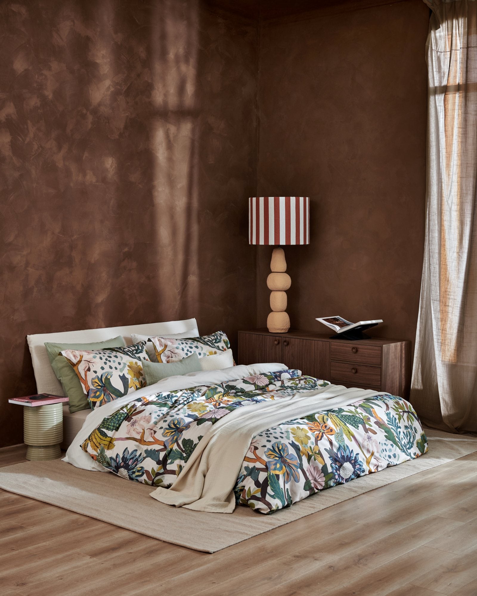 Eenpersoons dekbedovertrek uit de Satin Printed collectie, gemaakt van soepele satijn katoen. Met het Enchanted dekbedovertrek waan je je in een bloemige jungle met groen, geel en accenten van lichtroze, oranje en blauw op een lichte ondergrond. Het dessin is