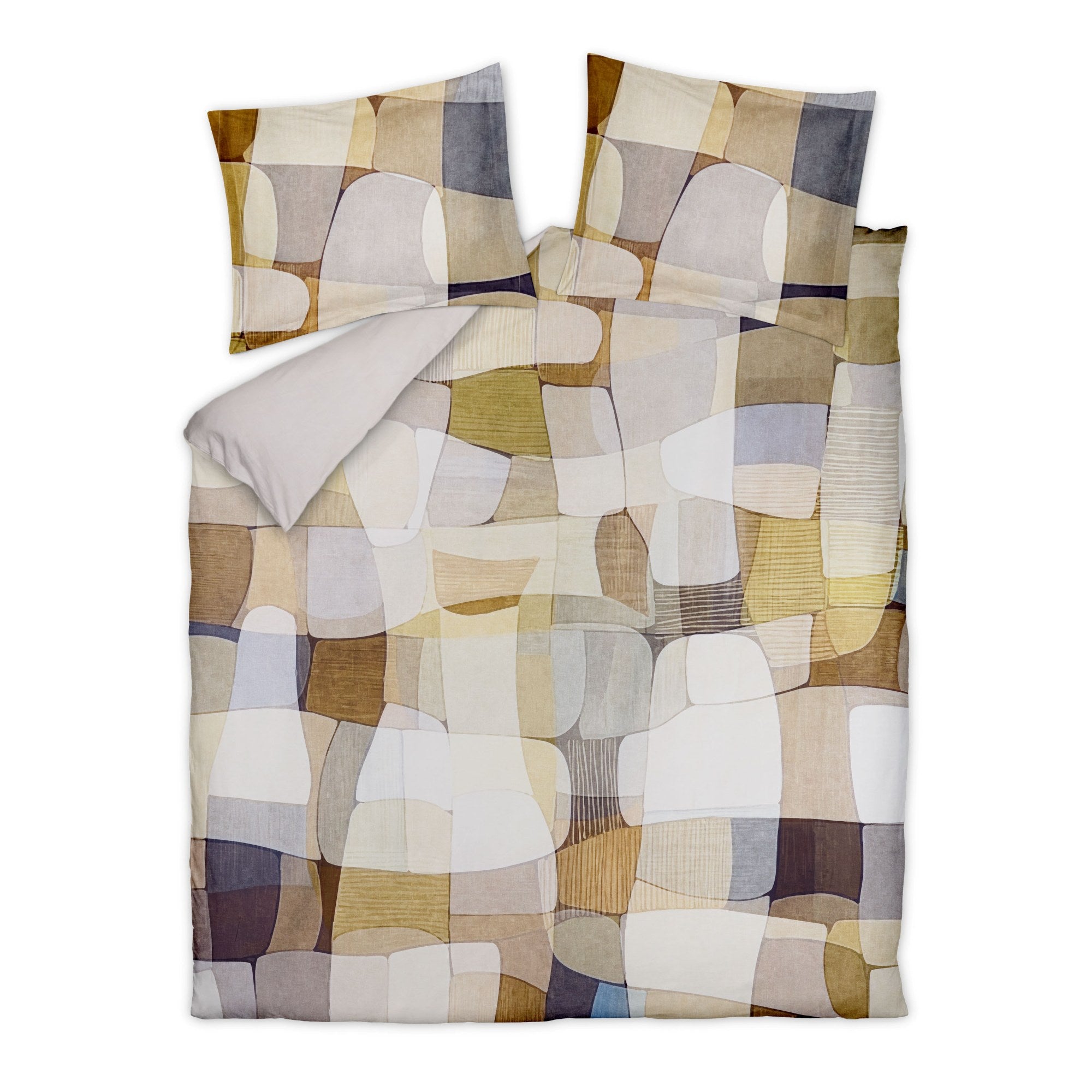 Lits jumeaux dekbedovertrek Pebble uit de Satin Printed collectie met aan de voorzijde een all over dessin van geometrische vormen die doen denken aan grote kiezelstenen. Hierbij zijn diverse tinten groen, grijsblauw en een beetje bruin gebruikt. Het dekbedovertrek is