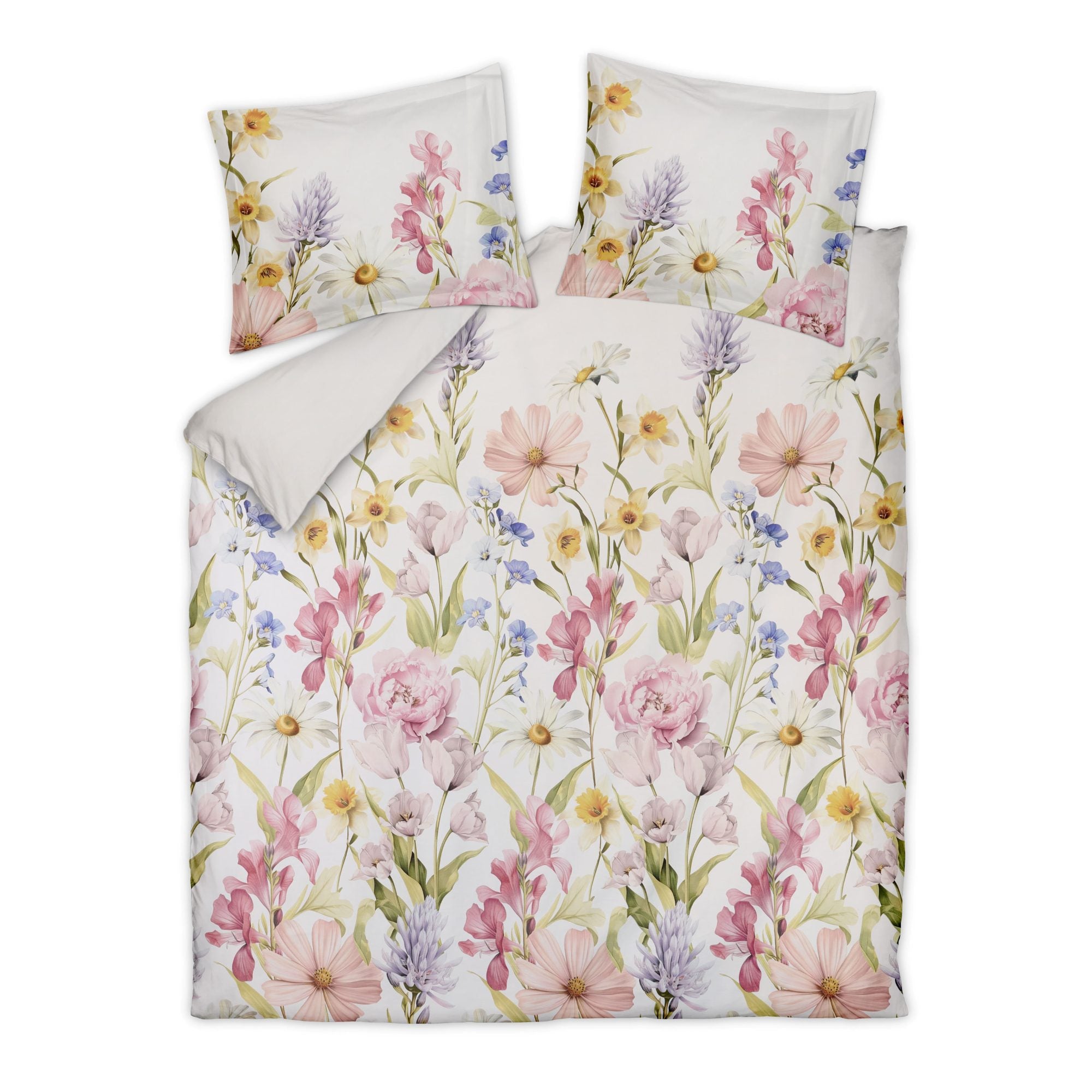 Offwhite lits jumeaux dekbedovertrek uit de Satin Printed collectie, gemaakt van soepele satijn katoen. Op de print van het Garden Glitz dekbedovertrek staan weelderige roze bloemen zoals pioenrozen, omringd door groene bladeren en bloemetjes in andere tinten zoals goudgeel, blauw en paars. De print staat op de hele voorzijde van het dekbedovertrek, de achterzijde van het dekbedovertrek is een lichte, effen kleur.