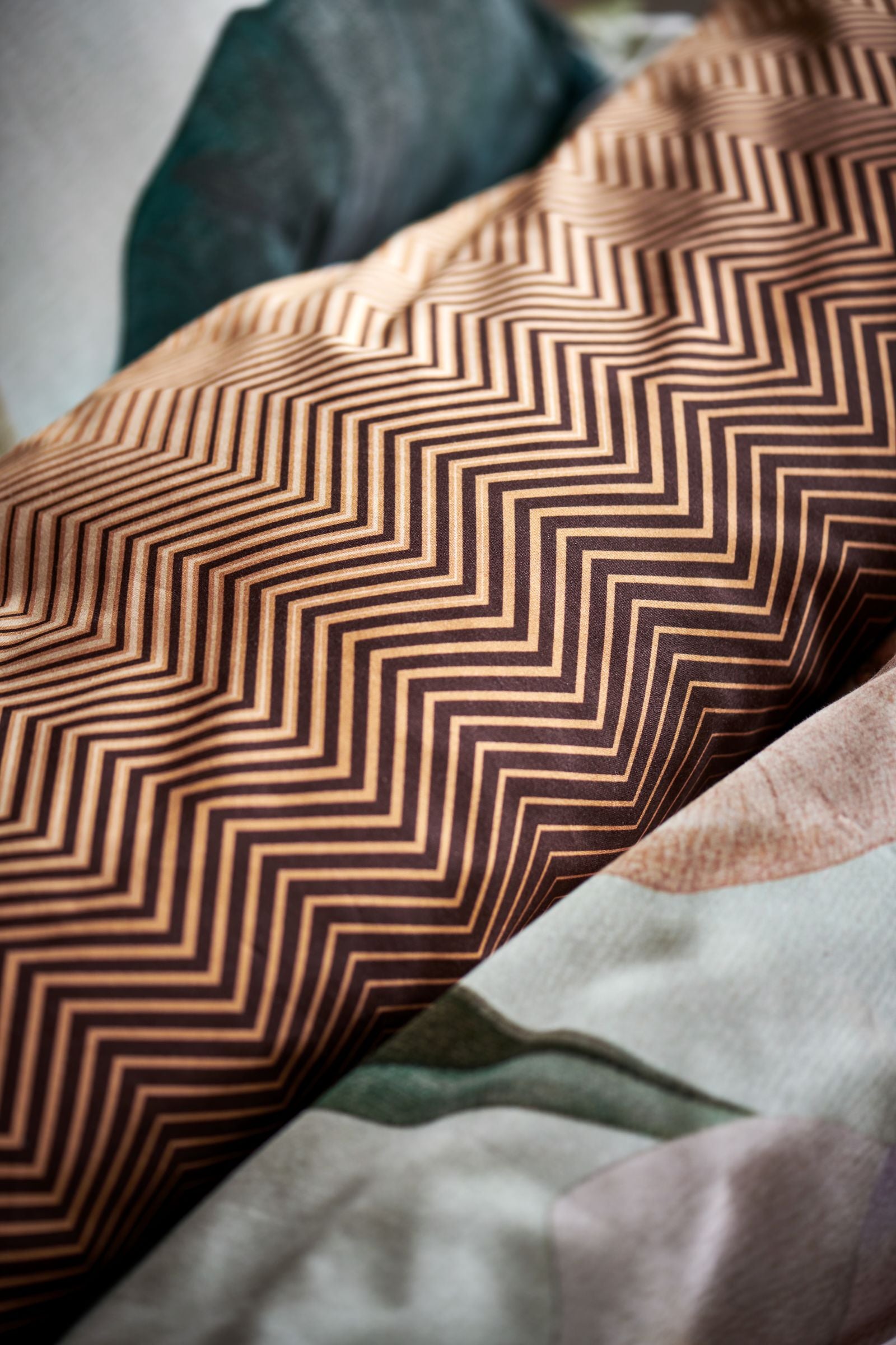 Tweepersoons dekbedovertrek uit de Satin Printed collectie, gemaakt van soepele satijn katoen. Het dekbedovertrek Aurora (SAM125218) heeft een speels zigzag patroon waarbij de kleuren groen, bruin en crème mooi met elkaar combineren. De print staat op de hele voorzijde van het dekbedovertrek, de achterzijde van het dekbedovertrek is een effen, naturel kleur.