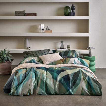 Het dekbedovertrek Celestial heeft een dessin van horizontale lijnen en blokjes in verschillende tinten groen, blauw en bruin. De rechte vormen en donkere kleuren geven dit Vandyck dekbedovertrek van 100% satijn katoen een stoere uitstraling. De achter