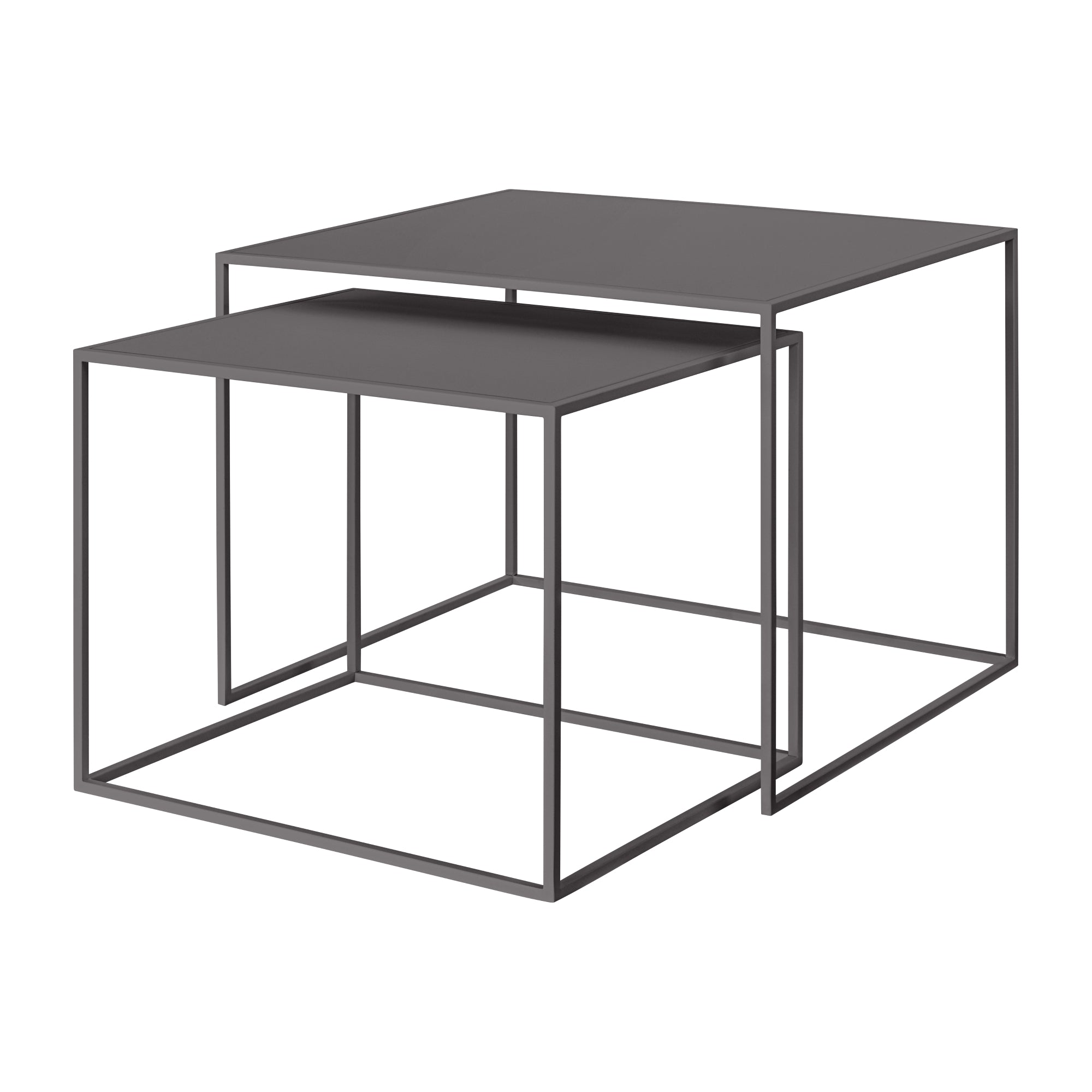 Set van twee grijze tafeltjes uit de Fera serie van Blomus, gemaakt van gepoedercoat staal met een strakke en industriële look. Het grootste tafeltje is 45 cm hoog, 60 cm breed en 50 cm diep. Daaronder past het kleine tafeltje met de afmetingen 40x50x40 cm. De siliconen dopjes