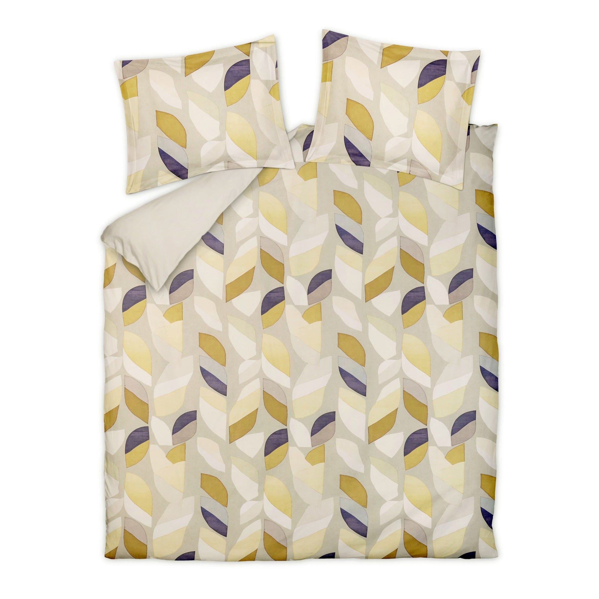 Grijsgroen lits jumeaux dekbedovertrek Leafcode uit de Satin Printed collectie met aan de voorzijde een all over dessin van abstracte blaadjes in gele en groene kleuren met hier en daar een donkerder paarsblauw accent. Het dekbedovertrek is gemaakt van soepele satijn katoen en de onderzijde is effen crème.