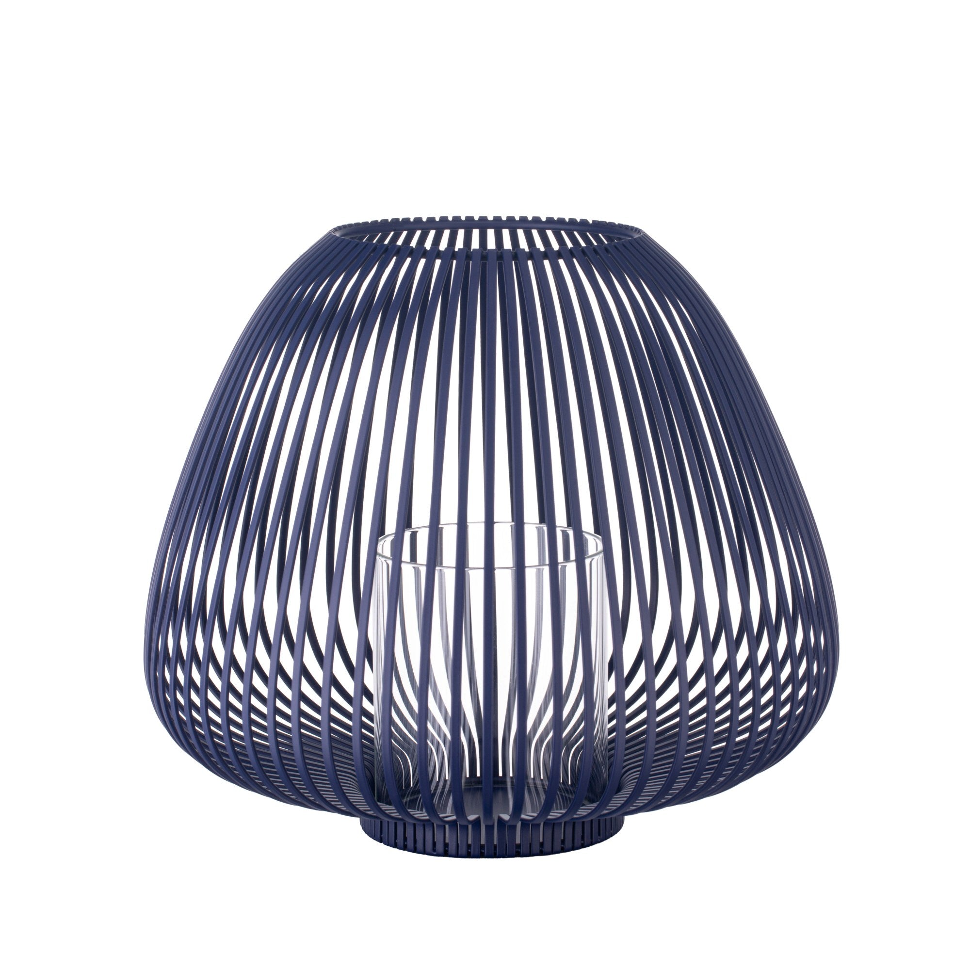 Stalen lantaarn met een donkerblauwe poedercoating, een diameter van 31 cm en hoogte van 26,5 cm. De verticale lijnen geven een sfeervol effect als er kaarslicht doorheen schijnt. Met de andere kleuren en maten uit de Lyva serie kan je zelf leuke sets creëren. Deze kaarshouder is ook te gebruiken als windlicht op een overdekt terras door het meegeleverde glas. De opening aan de bovenzijde heeft een diameter van 12,5 cm.