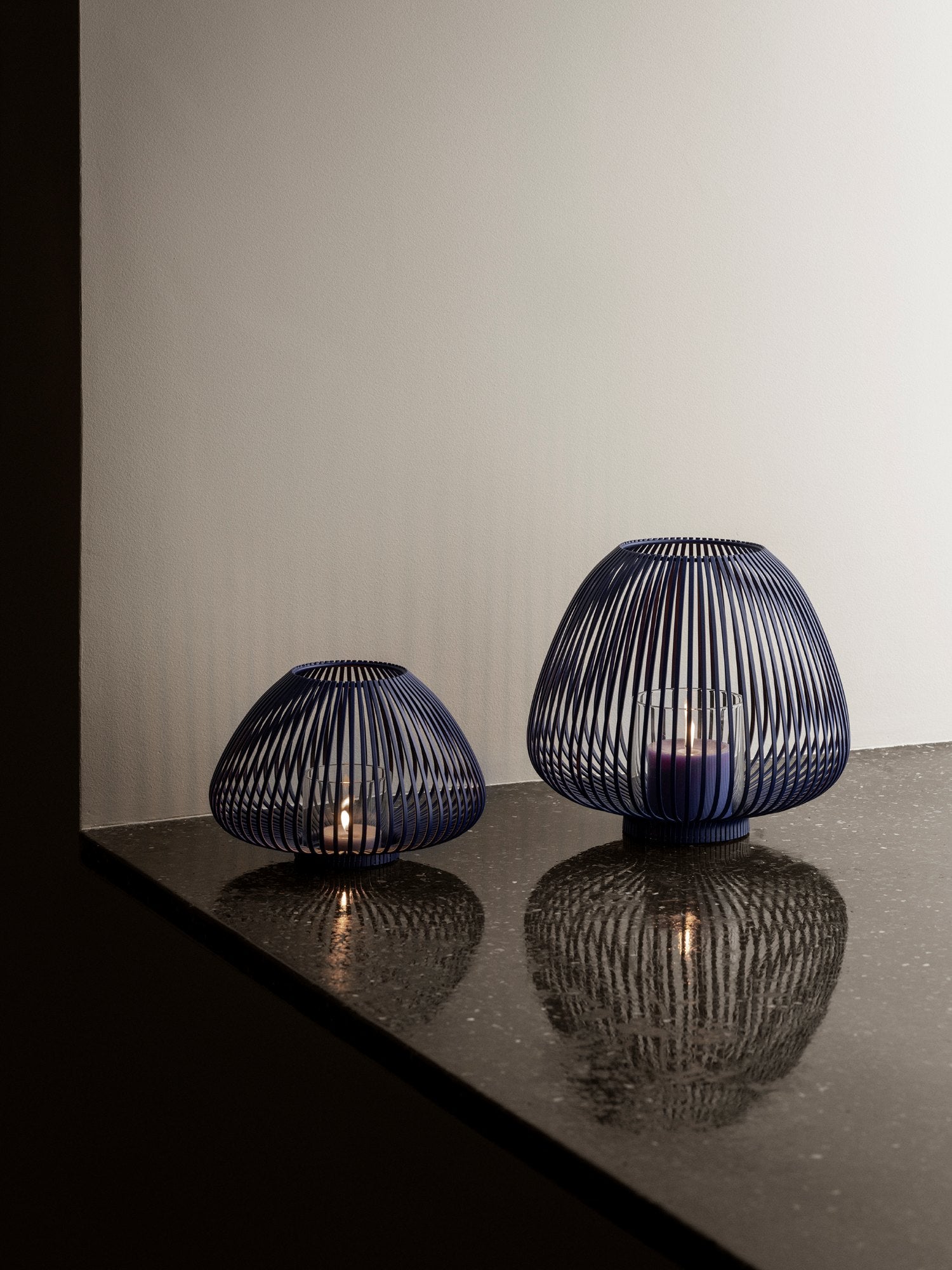 Stalen lantaarn met een donkerblauwe poedercoating, een diameter van 25 cm en hoogte van 17 cm. De verticale lijnen geven een sfeervol effect als er kaarslicht doorheen schijnt. Met de andere kleuren en maten uit de Lyva serie kan je zelf leuke sets creëren. Deze kaarshouder is ook te gebruiken als windlicht op een overdekt terras door het meegeleverde glas. De opening aan de bovenzijde heeft een diameter van 9,5 cm.