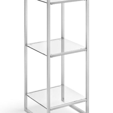 Dit badkamerrek is een praktisch, open opbergsysteem voor je handdoeken, verzorgingsproducten of andere badkameraccessoires. Het opbergrek heeft een strakke, minimalistische uitstraling door de rechte vormen en het gebruik van mat geborsteld RVS. De 3 schappen zijn gemaakt van glas.