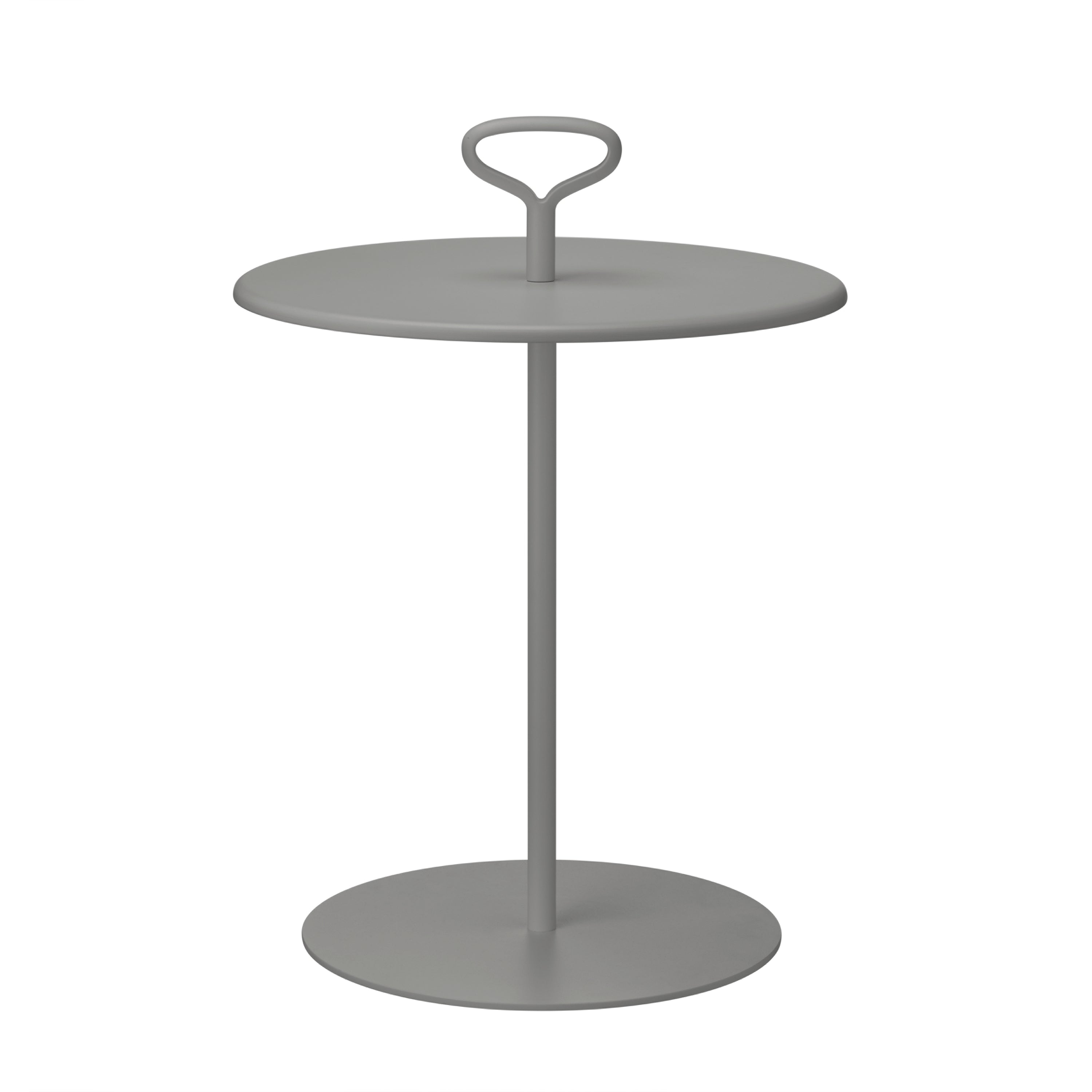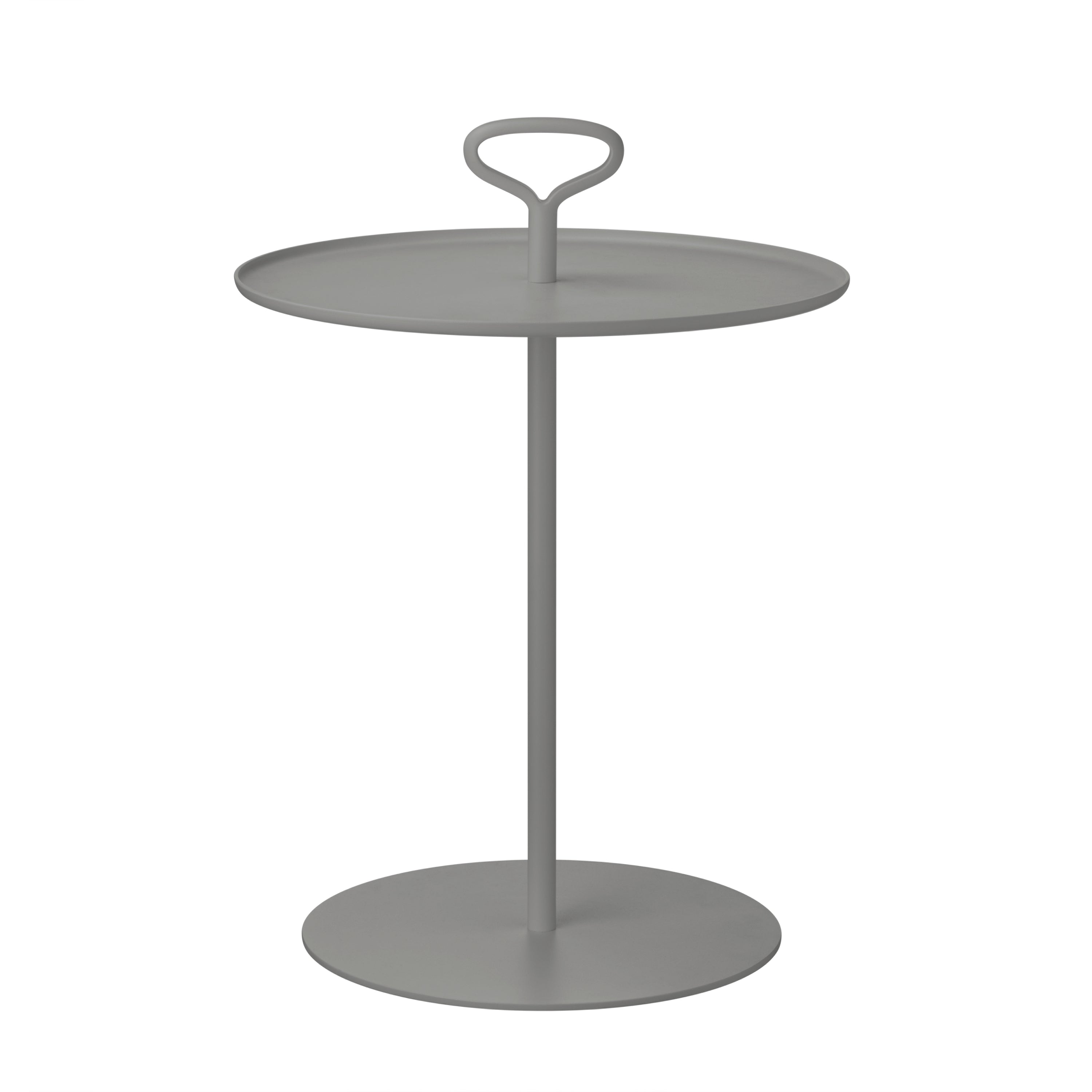 Grijze ronde bijzettafel voor buiten met een diameter van 42 cm. Het elegante handvat geeft het Porter tafeltje z'n kenmerkende look met typische Blomus uitstraling én maakt verplaatsen gemakkelijk. Ook schroef je hier het tafelblad mee vast dat tweezijdig te