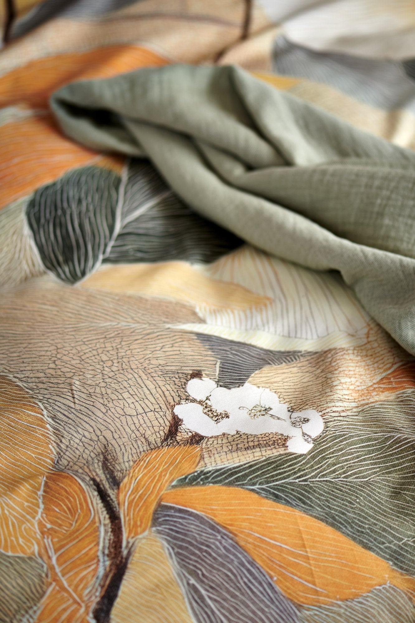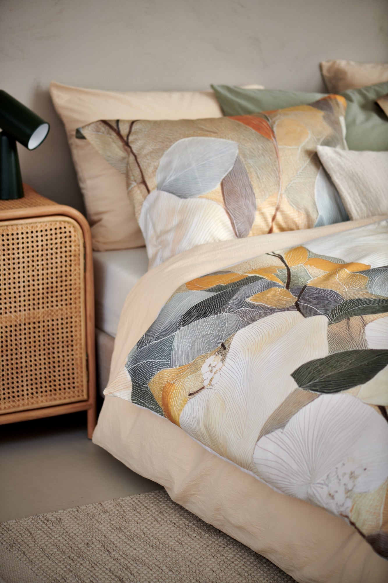 Tweepersoons dekbedovertrek Senna uit de Satin Printed collectie met een abstract dessin van bloemen en bladeren in verschillende geeltinten met groene accenten. Het dekbedovertrek is gemaakt van soepele satijn katoen met de print op de bovenzijde en een effen onderzijde in een crème kleur.