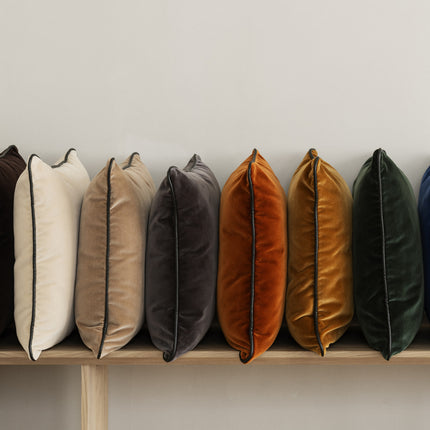 Geef je bank of bed een verfijnde uitstraling met deze prachtige fluwelen hoes voor een sierkussen. Hoogwaardig afgewerkt met een dikke zwarte bies van vegan leer en een ritssluiting van hoge kwaliteit (YKK). De hoezen zijn gemaakt van 100% katoen en geschikt om op 30°C te wassen.